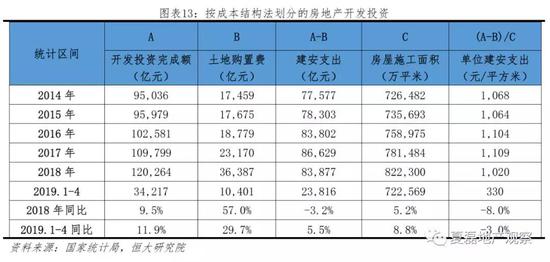 从成本结构来看,当前的投资强劲,主要是建安支出由降转升,土地支出增速仍较快。1-4月,剔除土地购置费后的建安支出同比增长5.5%,较2018年提高8.7个百分点,其中房屋施工面积提高3.5个百分点至8.8%、单位建安支出从-8.0%收窄至-3.0%;土地购置费同比增长29.7%,仍处于较高水平。