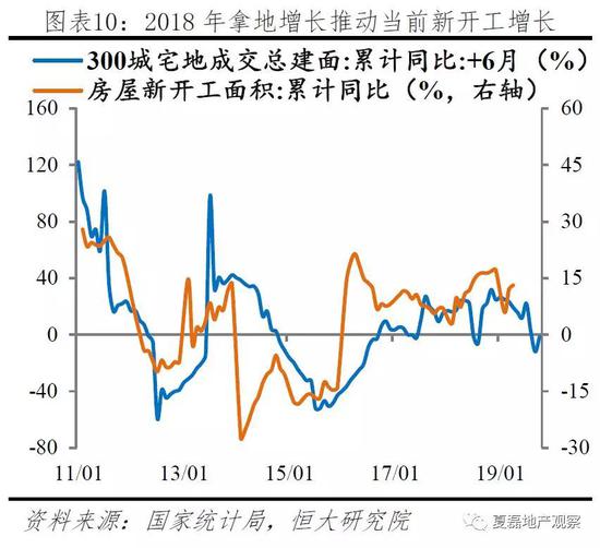 全国来看,土地成交领先房地产投资6-9个月,2018年拿地高峰进入开工、施工期,推动当前投资走强。2015-2018年,土地成交增速持续提升,2015年2月,300城住宅用地成交规划建筑面积累计同比下降52%,之后不断回升,在2018年5月达到32%的增长高点。2018年,300城宅地成交建面9.1亿平,创2014年以来新高。这部分新供给土地,在2018H2-2019H1集中进入开发阶段。