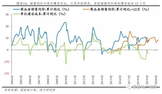 从成本结构来看,施工和单位建安成本的支撑因素都开始弱化、建安支出拐点临近,土地支出增速将继续回落。对于建安支出,一方面,施工增速拐点临近,主要由于拿地见顶回落的滞后传导效应逐渐显现;另一方面,单位建安成本增速大概率也即将见顶,主要由于销售均价增速在2018年末见顶、2019年初以来回落;对于土地购置费,前期土地成交价款增速持续回落的传导效应将继续作用,后续土地支出甚至可能出现负增长。