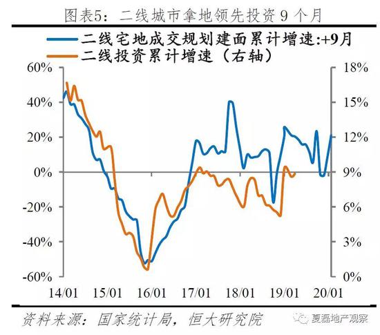 从领先指标来看,拿地见顶回落已经一年,决定了当下就是投资拐点。2018年5月以来,300城宅地成交建面累计增速达到32%的高点后持续回落,2019年5月降至5%。分城市能级看,一线、二线、三四线城市的土地成交累计增速分别在2018年的1月、5月和5月见顶回落,目前各线城市投资均已出现见顶迹象,印证投资拐点已现。