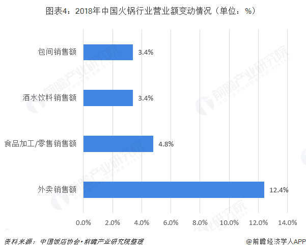 根据中国饭店协会统计数据显示,2018年中国火锅市场外卖销售、家栋零售、酒水饮料和包间等营业额都发生了变动,均呈上升趋势。其中,外卖销售额增长最快,增速达到12.4%,说明2018年即时配送产业的快速发展给火锅产业带来了新的机遇。