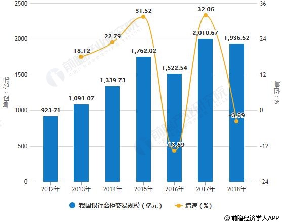2012-2018年我国银行离柜交易规模统计及增长情况