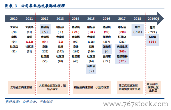 对于零售企业而言,所需要面对的不仅是变化的社会环境,更是自身经营状态的变化,只有不断寻找自身优势和社会发展的微妙契合点,才能推动企业持续发展。永辉自创立以来,在前端供应链上的建设一直坚定以生鲜为核心;而后端门店建设却切换过多种形态。成立初期,外资超市以管理经验和供应链优势称雄大卖场业态,风头一时无两,永辉选择了中型卖场业态,韬光养晦,避其锋芒。随着经营经营积累和供应链管理能力提升,永辉开始转型大卖场业态,并凭借生鲜特色迅速崛起。站稳脚跟之后,永辉敏锐发现消费升级趋势,积极推动精品店业态发展。随后,面对消费者对于便捷化的要求,永辉积极探索新零售业态,短暂尝试后更换了更贴合自身基因的社区店业态,以拉近地理距离的方式提升消费者体验。目前,永辉聚焦于以提升渠道效率为核心的大卖场业态和改善消费者便捷性体验的 MINI 店业态。