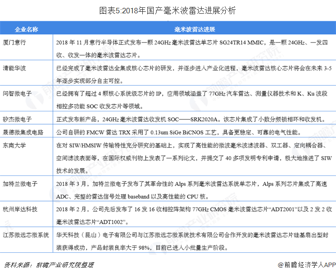 现阶段,国内24GHZ毫米波(中短距)雷达已实现量产,77GHZ毫米波(长距)雷达实现技术突破。2018年我国毫米波雷达出货量约为358万颗,同时也伴随着国产毫米波雷达芯片厂商包括厦门意行、清能华波、上海矽杰微、上海加特兰等的崛起,如2018年华城汽车24GHZ后向毫米波雷达实现批产供货。