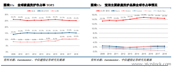 宝洁仍是全球家庭洗护行业巨头。2009-2018 年,宝洁、联合利华和德国汉高合计占据全球家庭洗护一半以上的市场份额,其中宝洁的市占率最高于 2018 年达 25.2%,高于第二名联合利华 9.9pct。在宝洁旗下的洗护品牌中,2018 年汰渍/碧浪以 14.5%的市占率稳居第一;2009-2018 年 Downy、Lenor 品牌的市占率提升 0.8、0.4pct,而 Gain、Ace、Dash/Daz 品牌市占率分别下降 0.3、0.8、0.6pct。