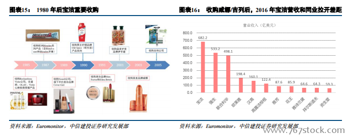 20 世纪初至 20 世纪 80 年代,宝洁率先通过自主研发的方式,相继开发了汰渍、佳洁士、帮宝适、Downy、舒肤佳、护舒宝、飘柔等核心品牌。伴随着各大品牌的本土畅销及二战后美国资本强势,宝洁先后在墨西哥、欧洲和日本等国设立分公司,迈出日化全球化拓展步伐。1980 年宝洁的销售额超 110 亿美元,遍及全球 23 个国家,并于 1988 年进入中国市场。20 世纪 80 年代后,宝洁通过外延并购的方式加快拓宽市场、品类与产品线,先后收购了潘婷、OLAY、Vicks、Blendax、Old Spice、Cover girl、Max Factor(含 SKII 产品系列)、Ellen Betrix、伊卡璐、吉列公司,其中吉列是宝洁迄今为止的最大并购,使其一举成为男士护理龙头,但巨额支付款也使宝洁此后放缓了并购步伐。综上,全球化拓展叠加外延并购,助力宝洁稳座全球最大的日用消费品公司(2003 年收购威娜后超越联合利华,成为全球最大日化公司;2005 年收购吉列后与同业拉开差距)。