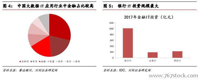 中国金融企业主动拥抱信息科技。中国金融企业主动拥抱信息科技,中国在金融行业应用大数据 IT 较多,仅次于互联网和电信,金融领域中银行业 IT 投资规模最大,约为证券 IT 投资的 5倍、保险 IT 投资的 4.5 倍。在银行脱媒的背景下,银行在精细化管理、风控能力和服务水平等提出了更高的要求,因此银行业加大信息化投资。
