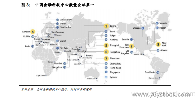 金融科技国内外竞争格局:国外起步较早,中国后来居上。美国科技公司十年前开始布局金融版图,中国金融科技紧跟美国,得益于中国巨大的网民数量和电子商务培养的用户习惯,中国金融科技发展出现领先全球的态势并开始全球化布局。支付宝已接入海外 26 个国家超过 12 万线下商户门店,微信支付已登陆 13 个海外国家和地区,覆盖超过 13 万线下门店。