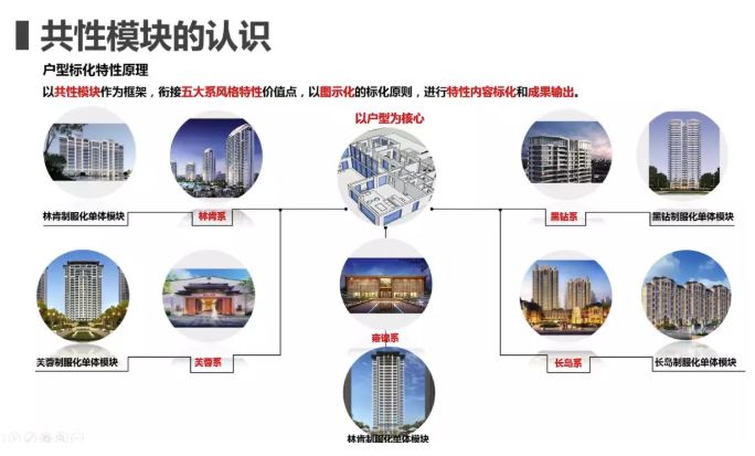 所以蓝光的标准化是以共性模块作为框架的,而五大不同风格的产品系其实是共享一个共性模块,这个共性模块其实代表的就是人对于居住产品的一种永恒不变的共性需求。