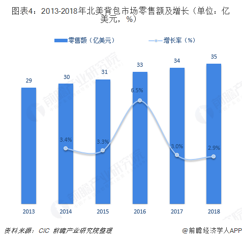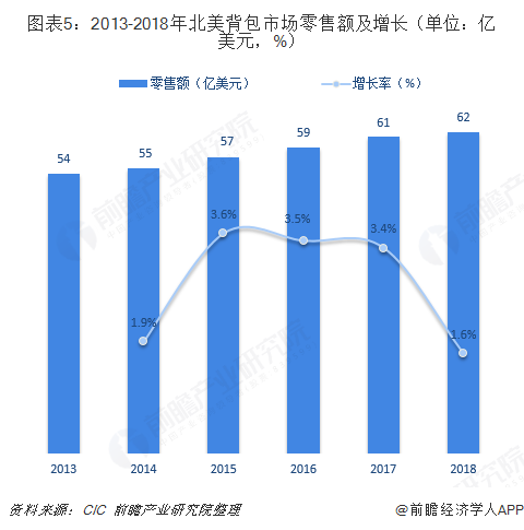 相比亚太地区,北美、欧盟市场一直是中高端背包产品的主要客户市场。北美背包市场特点是品种繁多,消费者选择面广,市场竞争比较充分,但消费者喜新厌旧,商品的更新换代速度快,因此市场零售额得以持续增长。2018年,北美背包市场零售额约为35亿美元,同比增长2.9%。