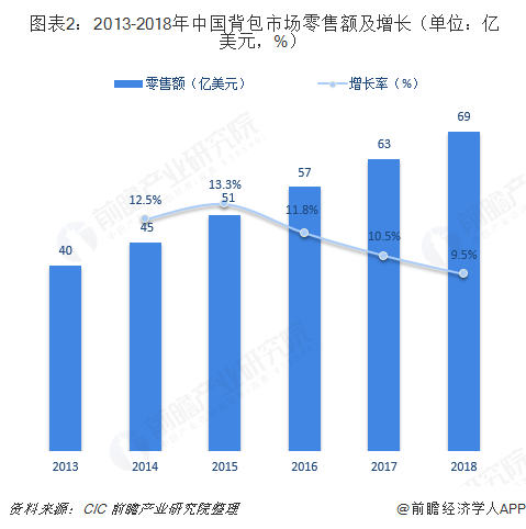 数据显示,2018年,中国背包行业市场零售额高达69亿美元,同比增长9.5%,占全球背包零售额的26.14%。中国背包市场的强劲发展,得益于居民收入水平的快速提升以及消费升级带来的产品价格提升。