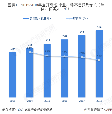 随着全球生活和消费水准不断地提升,以及户外活动的日益普及,各式各样背包已成为人们身边不可或缺饰品。在市场需求推动下,全球背包行业市场零售额节节攀升。根据CIC数据统计,2013-2018年,全球背包行业市场零售额复合年增长率达8.1%,到2018年全球背包市场零售额已超过260亿美元。