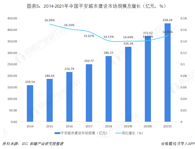 我国安全产业发展呈现出新态势,安全产业的迅猛发展为平安城市建设提供了良好的发展环境;随着我国社会主要矛盾转变为人民日益增长的美好生活需要和不平衡不充分的发展之间的矛盾,社会公共安全需求也呈现出新的特点,更高的需求促进平安城市建设产业发展。再加上政策频发推动,平安城市建设向更高质量转变。2018年。我国平安城市建设市场规模约为286.15亿元,未来将继续保持14%以上的增速快速增长。