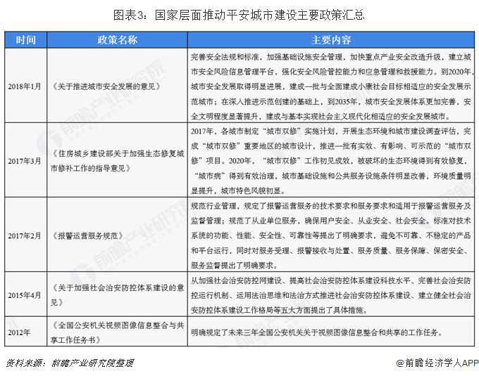 为了更好的维护社会治安,降低犯罪率,提升城市的整体幸福感,国家提出了一系列的政策法规,与此同时,以安防监控为技术手段的平安城市建设逐步成为国家以及各地政府重点开展的城市公共安全建设工作。平安城市建设由1996年“科技强警”开始,20年期间国家频发政策推动建设步伐,2018年1月7日,中共中央办公厅、国务院办公厅印发了《关于推进城市安全发展的意见》,提出要加强城市的安全风险管控能力,深化隐患排查治理,提升应急管理和救援能力。