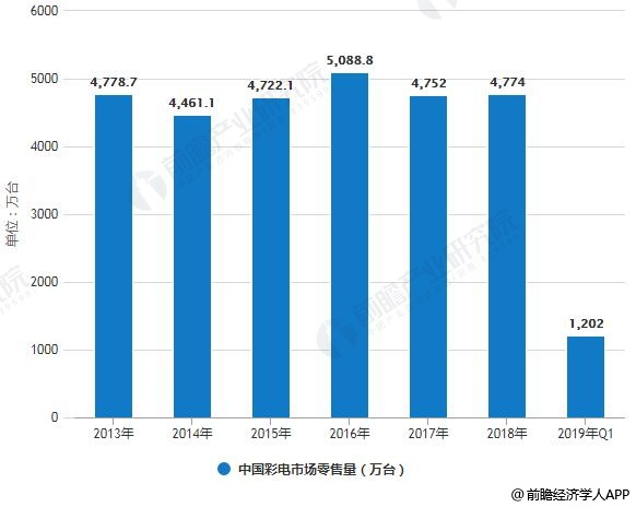 2013-2019年Q1中国彩电市场零售量统计及增长情况