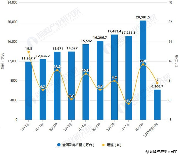 在产量方面,近年来,国内彩电市场受房地产调控,液晶面板大幅涨价等因素的影响,市场增长乏力。从我国彩电的产量变化情况来看,2017年我国彩电的产量为17233.1万台,同比下滑了1.4%。我国大多数彩电厂家采用以销定产的模式生产,产量增长乏力从侧面反映出我国彩电需求增长乏力。截止至2018年全年全国彩电产量达到了20381.5万台,累计增长14.6%。进入2019年4月全国彩电产量为1688.6万台,同比增长5.7%。累计方面,2019年1-4月全国彩电产量为6206.7万台,累计增长7%。
