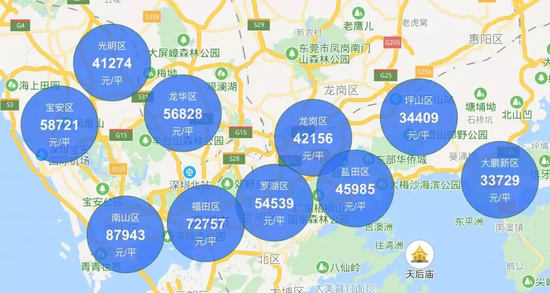 这意味着2-3年以后你去深圳买房,西乡均价至少8万,龙华接近9万,现在觉得很偏的光明都可以卖到6.5万,坪山怎么着也得4.5万起步了!