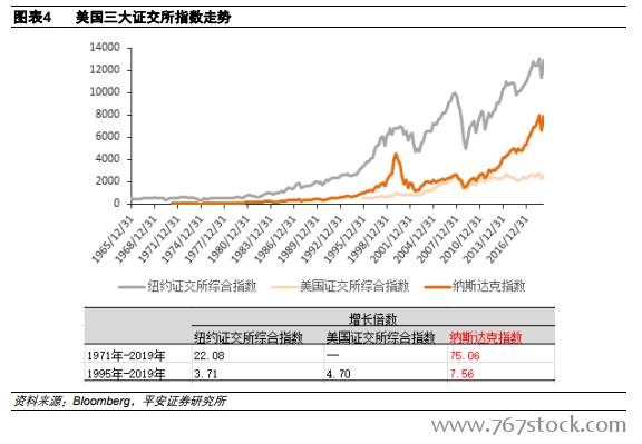 纳斯达克指数涨幅突出。纳斯达克受到众多上市公司的青睐,同时投资机构们也乐于在此寻宝,在各方资金的追捧之下,纳斯达克指数在三大指数中表现最为亮眼。从 1971 年开始交易,到 2019 年,纳斯达克指数翻了 76倍,同期纽交所综合指数翻了 22 倍;从 1995 到 2019 这 24 年间,纳斯达克指数翻了 7.6 倍,同期纽交所综合指数翻了 3.7 倍,美国证交所综合指数翻了 4.7 倍。纳斯达克成为追求高收益资金的必配板块。