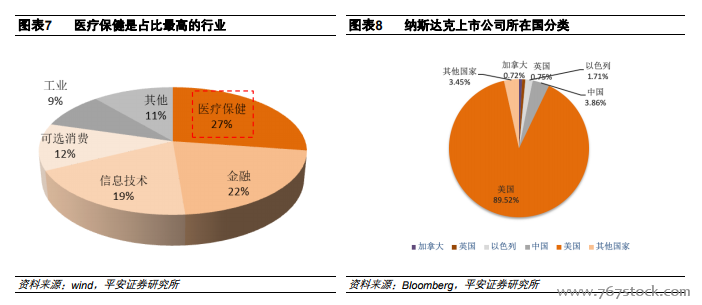 医疗保健是占比最高的行业。生物医药行业在产品上市前的研发投入大,回报周期长,一个创新药的上市平均需要“10 年 10 亿美元”。这样的行业属性决定了创新药公司在盈利前的很长一段时间内需要大量资金支持。纳斯达克允许未盈利公司上市,给生物科技类公司提供了最佳融资场所。因此,在纳斯达克交易所上市公司中,医疗保健公司的数量占比达到 27%,是占比最高的行业,第二名是金融,占比 22%。