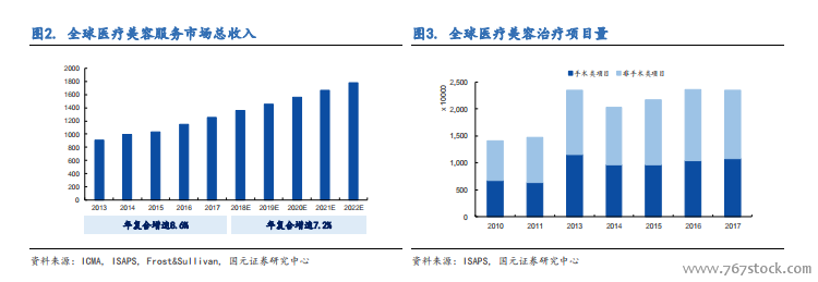 全球医美市场近万亿规模,已经步入稳定增长阶段。根据国际美容整形外科学会(ISAPS)统计数据,2017 年全球医疗美容总治疗项目量为 2339 万例,同比 2016年的 2347 万例略有下降,其中手术治疗量和非手术治疗量分别为 1077 万例和 1262万例,同比 2016 年分别增长 5%和下降 4%。(ISAPS 基于各类国家的整形外科医生调研数据,不涵盖中国数据,仅供参考)。根据国际调研机构数据显示,2017 年全球医疗美容服务市场规模为 1258 亿美元,预计 2018-2022 年复合增速为 7.2%,到 2022年将进一步增长为 1782 亿美元,折合约为 1.2 万亿元。
