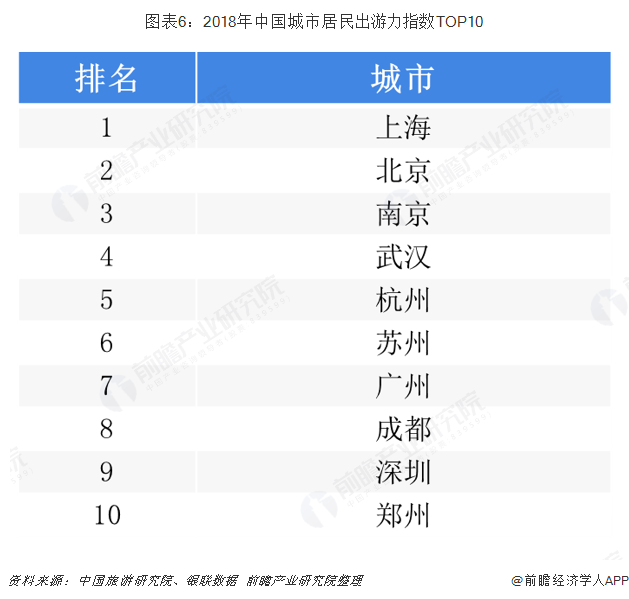 因此,结合我国城市居民出游力指数(城市居民旅游消费支出/城市居民消费总支出)来看,出游力指数呈现东南沿海地区较高、西北地区较低的局面,但中西部地区出游力指数与东部地区差距有所缩小。2018年全国城市居民出游力指数排名前十位的城市依次是:上海、北京、南京、武汉、杭州、苏州、广州、成都、深圳、郑州。
