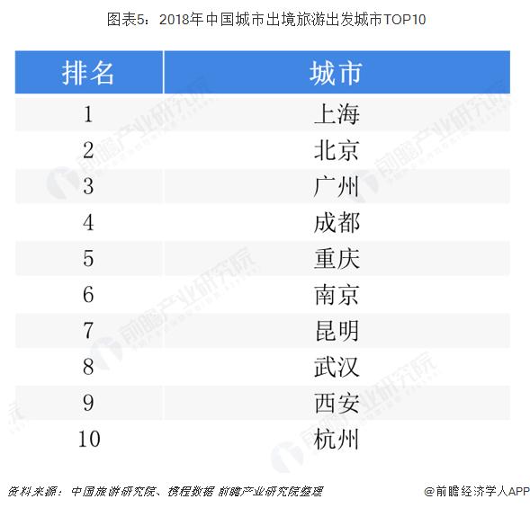 在2018年我国出境旅游出发城市TOP10中,上海、北京、广州三大一线城市包揽前3位,这是因为一线城市的国际航线较为密集。其次是成都、重庆、南京这三座新一线城市,在我国签证、航班等便利因素影响下,新一线及二线城市新增了大量国际航线和签证服务中心,使得人们出境旅游越来越方便,“新一线”城市已开始为我国出境旅游市场贡献客群。
