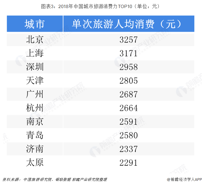 从我国各大城市居民旅游消费力来看,2018年我国旅游消费力前十的城市分别是:北京、上海、深圳、天津、广州、杭州、南京、青岛、济南和太原。可以看出,目前我国一线城市仍然是旅游消费市场主力,北上广深分列第1、2、5、3位,北京和上海的单次旅游人均消费已超过3000元。