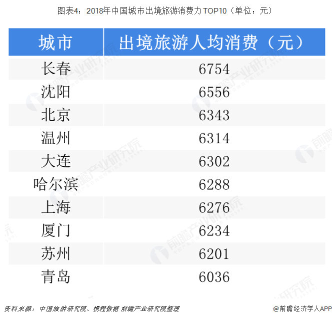 虽然北上广深四大一线城市综合旅游消费能力排在全国前列,但在我国出境旅游消费上,根据携程旅游的数据显示,2018年我国出境游消费力城市TOP10中包揽1、2名的是北方老牌工业城市!长春市以人均出境游消费达到6754元位居第一;紧接着是沈阳市以人均6556元的出境游消费额排名第二;而一线城市北京则排在第三名,人均出境游消费6343元。深圳、广州分别位列第13、16名,第4-10名基本上被二线、“新一线”城市占据。