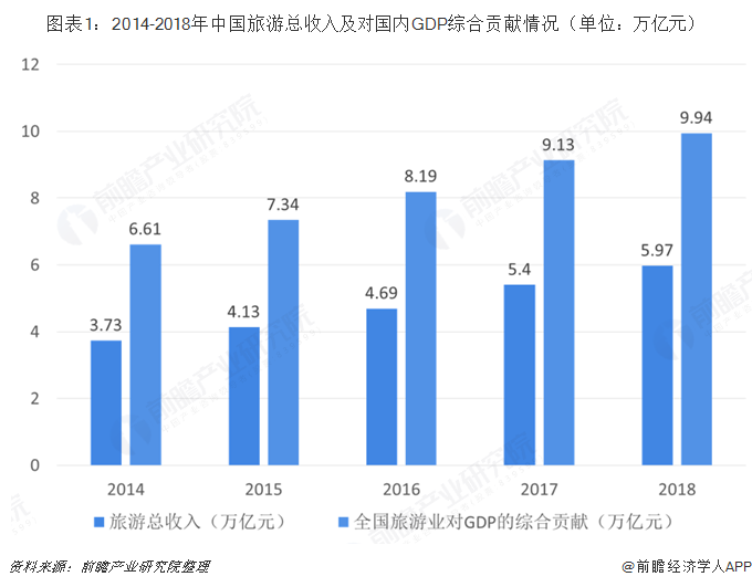 根据国家文化和旅游部数据显示,2018年,我国旅游业发展迅猛,产业规模持续扩大,产品体系日益完善,市场秩序不断优化,全年全国旅游业总收入达5.97万亿元,对我国GDP的综合贡献为9.94万亿元,占我国国内GDP总量的11.04%。旅游业带动相关产业和社会经济活动的全面发展,是我国经济发展的支柱性产业之一,旅游产业的发展极具活力。