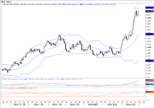 周四美国最新出炉的美国一季度GDP终值和初请数据均表现略不及预期。数据出炉之后,美元指数保持窄幅震荡,现交投于平盘下方。现货黄金则受到美国国家经济顾问库德洛讲话的影响,短线一度小幅拉升,但日内仍维持跌势。库德洛表示,市场正在告知美联储降息,在利率前景上同意市场观点。受讲话影响,黄金自1400美元回升超过15美元。之前也提到,前几天黄金的回调幅度大是以美元轻微反弹为导火索,实质是因为前期涨势过快,多头获利盘趁机涌现的反应,而美国降息的预期,利好黄金的基本面逻辑还没有改变,稳健者以做多为主的策略应该维持。