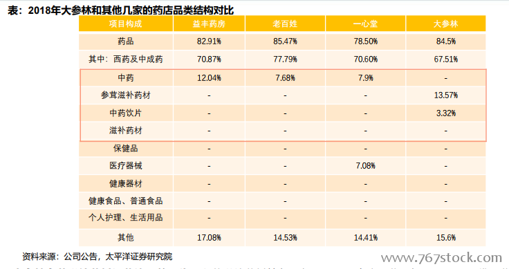 参茸滋补药材差异化经营,省外复制初现成效。大参林参茸滋补药材经营体现差异化:参茸滋补药材特色业务,子公司中广州紫云轩(100%)、佛山紫云轩(100%)、广东紫云轩中药科技(100%)均为参茸及中药饮片加工企业,形成了较为明显的差异化竞争优势。公司参茸滋补药材和中药饮片在商品品类占比达到16.89%,与其他药房相比差异化明显(因披露口径差异,取中药+滋补+中药饮片合计占比)。参茸滋补药材和中药饮片收入增速、毛利率较高,推动整体盈利能力提升: 18年中药饮片和非药品的收入分别增长22.97%和27.54%,主要得益于公司对大健康产业的布局优化,加强与药品联动健康的品类开发;以顾客需求为导向,挖掘顾客的健康产品需求,通过精准的会员营销功能使得大健康品类产品销售提升,整体零售毛利率提升至40.54%。