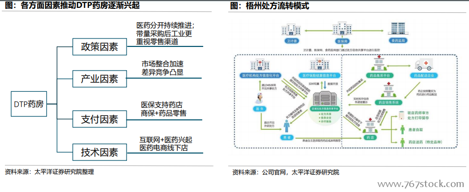 接入处方流转平台+DTP贡献增量。目前,包括北京、四川、广东、福建等地及部分医院已经在试点电子处方外流,政策鼓励及政府主导的处方共享平台的搭建使得处方外流逐步进入实质进展期。而从近期浙江医保局关于允许慢病处方流向药店及允许连锁药店参与配送(目前处于征求意见阶段)的文件中可看出,大连锁药店的品种、覆盖面、配送能力最符合参与配送的要求,将显著受益。在政策、产业等因素的推动下,工业企业、各大零售药店以及具备批零一体化优势的批发企业纷纷加大布局DTP业务,承接处方外流。2017年国内DTP药房规模约130亿元。一方面,DTP药房非常依赖供应链资源,以拿到药企新药的代理权,另一方面,零售企业耕耘市场多年,拥有丰富的工业资源和医院资源,在医药分开、渠道下沉的情况下,其DTP药房能够帮助医院承接新特药院外供应需求,同时开拓新销售渠道。二者互相成就,零售终端布局DTP药房未来将创造巨大价值。