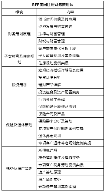 RFP内容是全面理财规划,涵盖比较全面,且投产比较高,因为它更注重的理论基础上的实操,要学习的内容是基础财务策划、投资策划、保险及退休策划、税务及遗产策划、高级财务策划。