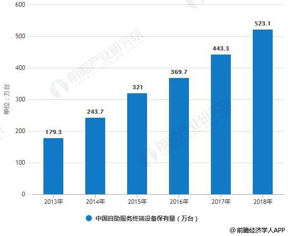 据前瞻产业研究院发布的《中国自助服务终端行业市场前瞻与投资战略规划分析报告》统计数据显示,2013年我国自助服务终端设备保有量已达179.3万台。2015年我国自助服务终端设备保有量突破300万台,到了2017年我国自助服务终端设备保有量增长至443.3万台,截止至截止2018年我国自助服务终端设备保有量突破了500万台,达到了523.1万台,同比增长18.00%。