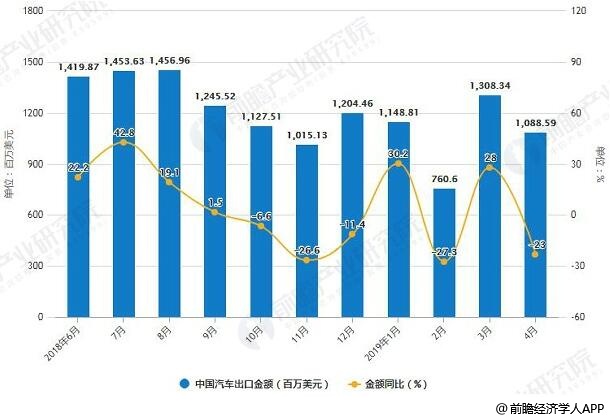 2018-2019年4月中国汽车出口量、金额统计及增长情况