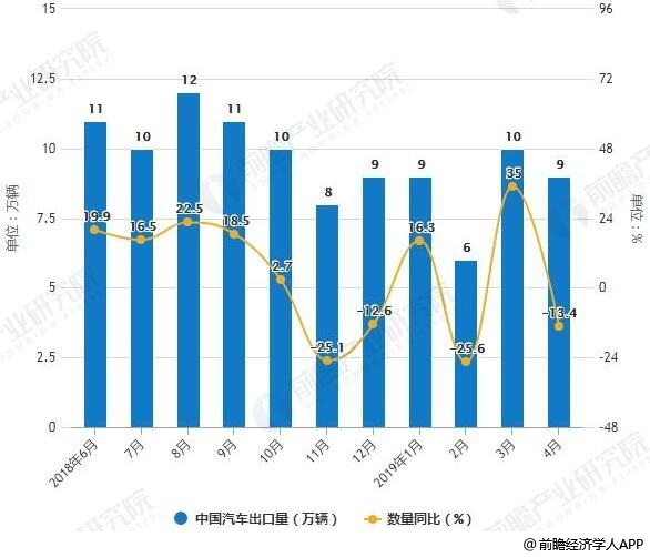 据前瞻产业研究院发布的《中国汽车整车制造行业需求前景预测与投资战略规划分析报告》统计数据显示,2018年我国汽车出口达到百万量级,共计出口车辆达到了115万辆,同比增长11.3%。截止至2019年4月中国汽车出口量为9万辆,同比下降13.4%。累计方面,2019年1-4月中国汽车出口量为34万辆,同比增长1.1%。