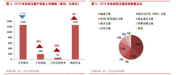 遥感卫星主要包括光学成像卫星和雷达成像卫星两种,光学成像卫星需求较大。光学成像卫星携带可见光、红外和多光谱等遥感器,最大优点是分辨率高,但由于是被动遥感,因此在弱光环境下无法工作;雷达成像卫星携带合成孔径雷达等遥感器,由于是主动遥感,因此可以胜任全天候工作。截至 2017 年 8 月 31 日,在轨遥感卫星数量为 620 颗,相比 2016 年 8 月 31 日的 376 颗增加 244颗。其中光学成像卫星占比 52.7%;雷达成像卫星占比 7.3%;红外成像卫星占比 1.1%。其中光学成像卫星数量同比上年的 165 颗增长接近一倍,是遥感卫星的数量增长的主要推动因素。
