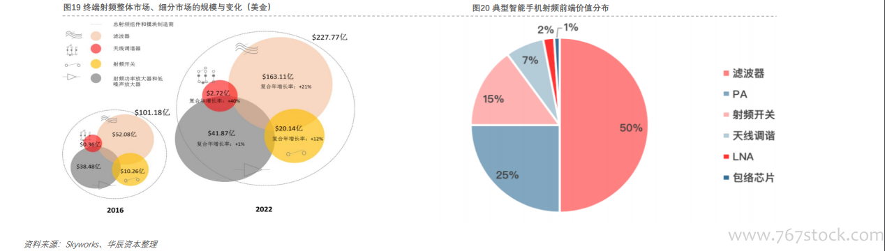 5G终端射频市场规模预测。根据Skyworks数据,预计到 2022 年终端射频市场将达到 227 亿美元,复合年增长率将达到14%;但各组件增速不一,滤波器的复合年增长率为21%,开关的复合年增长率为 12%,而射频功率放大器和低噪声放大器(PAs & LNAs)的复合年增长率仅为 1%;5G的频段数的增加、天线数的增加以及载波聚合等因素,预计5G终端射频的单机价值量将超过50美元;但射频前端占手机成本的9%,而滤波器为手机射频前端的最大价值点,其次为功率放大器和开关。