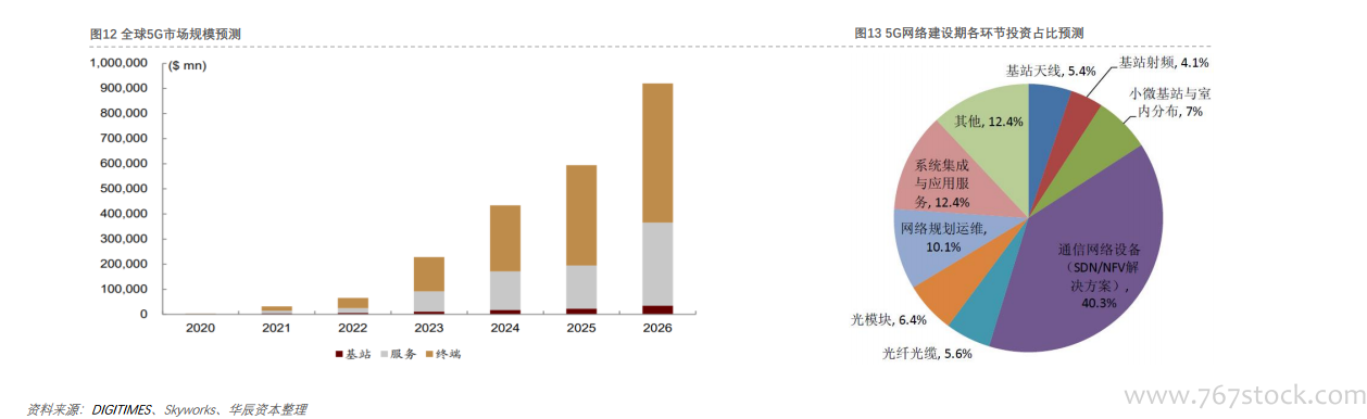 5G市场规模预测。5G 基站市场整体规模相对终端较小:预计 2020 年 5G 基站整体市场规模为 11.43 亿美元,到 2026 年增长至 342.86 亿美元,2012~2026 年的复合增速在50%以上, 到 2026 年市场规模约为手机的 1/16。5G网络建设投资中,各产业链投入时序和投资占比有所不同,其中基站系统部分的天线、基站射频、小微基站与室内分布将分别为5.4%、4.1%和7%。