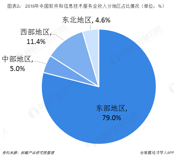 目前,我国东部地区软件业稳步发展,中西部地区软件业加快增长。2018年,东部地区完成软件业务收入49795亿元,同比增长14.2%,占全国软件业的比重为79.0%。中部和西部地区完成软件业务收入为3163亿元和7189亿元,分别增长19.2%和16.2%,占全国软件业的比重为5.0%和11.4%。中西部地区软件业务收入增速抢眼,行业走特色发展之路,部分省市利用新业态迅速发展、产业转型升级、布局出现调整的机遇期,积极打造特色产业,推动软件业快速发展。如:安徽省大力发展智能语音产业,湖北省利用地理空间信息产业优势开拓新型互联网信息服务,贵州省抢先布局大数据领域等。东北地区完成软件业务收入2914亿元,同比下降0.4%,占全国软件业的比重为4.6%。