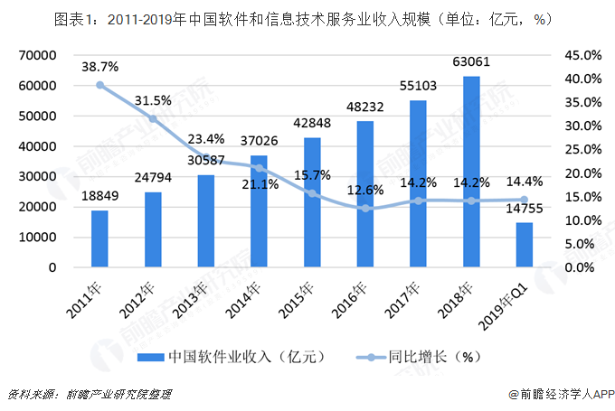 2018年,我国软件和信息技术服务业总体保持平稳较快发展,行业规模进一步扩大。全国软件和信息技术服务业累计完成软件业务收入6.31万亿元,同比增长14.2%。2018年,我国软件和信息技术服务业收入占全国GDP比例上升至7.01%,在我国宏观经济增速放缓的趋势下,软件行业表现出较强的抗周期性,主要原因在于技术创新和迭代驱动下的行业高景气以及政府政策推动下的信息化建设需求的提升。2019年以来,我国软件业也呈现出向好态势,在2019年第一季度,我国软件和信息技术服务业累计完成软件业务收入1.47万亿元,同比增长14.4%。