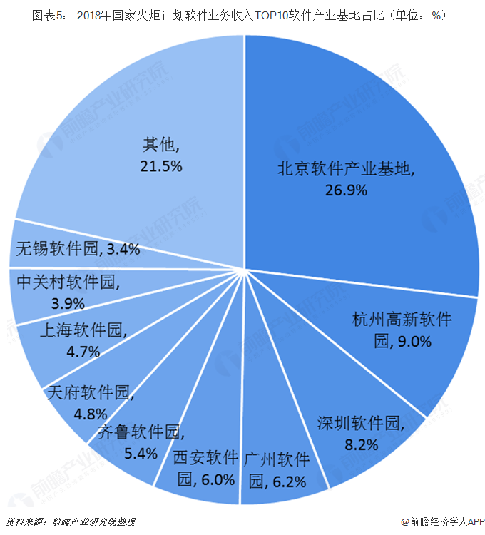 结合我国《2018年中国火炬统计年鉴》的数据,2017年我国火炬计划各大软件产业基地合计完成软件业务收入达到29129.49亿元,其中北京软件产业基地完成软件业务收入最高,达到7836.7亿元,占全国整体的26.9%;杭州高新软件园排第二,完成软件业务收入2617.2亿元,占9.0%;第三是深圳软件园,完成软件业务收入2399.0亿元,占8.2%。而中西部城市西安和成都的软件园也进入了国家火炬计划软件业务收入前十,甚至超越了上海软件园的软件业务收入。