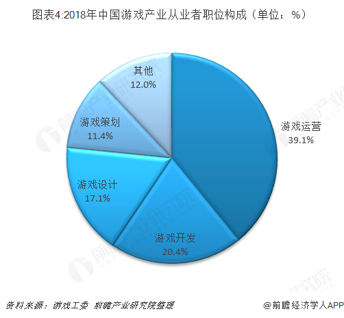 2018年中国游戏产业从业者约有145万人。其中游戏运营类职位占比39.1%,游戏开发类职位占比20.4%,游戏设计类职位占比17.1%,游戏策划类职位占比11.4%。