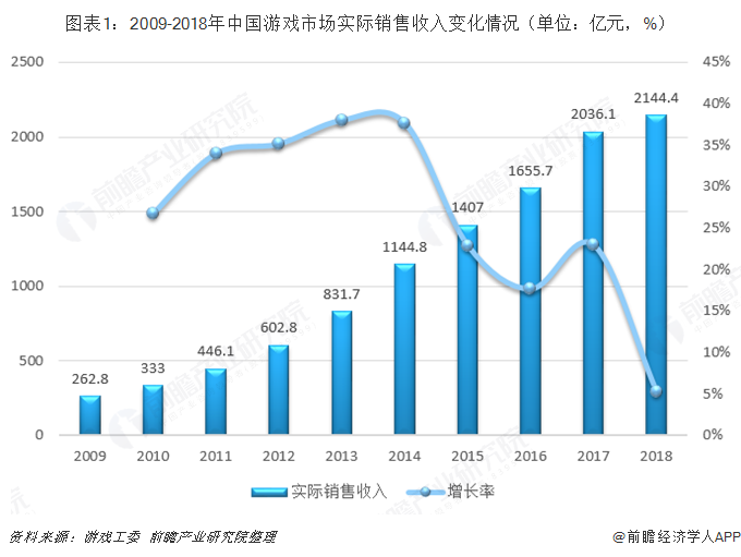 游戏工委数据显示,2018年中国游戏实际销售数据达2144.4亿元,同比增长5.3%。对比前两年游戏产业两位数的增幅趋势可以看出,2018年中国游戏产业在整体收入上的增速明显放缓。