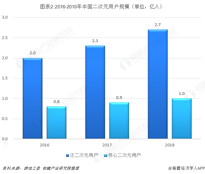 据游戏工委数据统计,2018年中国二次元用户规模达3.7亿,其中泛二次元用户2.7亿人,核心二次元用户1亿人。国内二次元用户规模的壮大,为二次元游戏的发展奠定了基础。所谓二次元游戏,狭义是指二次元核心粉丝认同的二次元游戏,如哔哩哔哩代理发行的《命运/冠位指定》(Fate/GrandOrder)、网易自行研发的《阴阳师》等;广义是指改编自知名二次元IP、或与之联动的,如DeNA中国与万代南梦宫联合推出的《航海王:启航》、掌趣推出的《初音未来:梦幻歌姬》等。