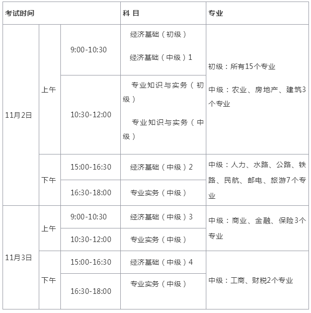 经济师考试每年举行一次,考试日期一般设在每年11月初,《经济基础知识》科目和《专业知识与实务》科目实行合并组织、分科目连续作答的方式,每个科目考试时长(最长作答时间)为1.5小时,两科目总计考试时长为3小时。2019年经济师考试时间已公布,具体科目及考试时间如下: