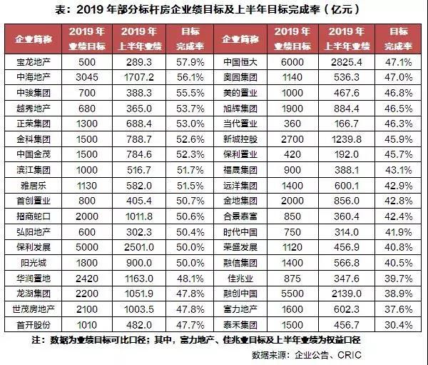 对于此前已提出2019年全年业绩目标的房企而言,截止6月末的目标完成情况尚佳,36家房企中有32家的目标完成率在40%以上。宝龙、中海、中骏、越秀、正荣、金科、金茂、滨江、雅居乐等房企上半年业绩完成情况较为乐观,目标完成率超过50%。