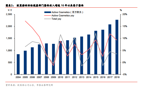 全球范围来看,功效性护肤品在成熟市场的增长快于化妆品行业整体。以欧莱雅为例,根据公司公告,18 年其健康活性部门(包含薇姿、理肤泉、修丽可等功效性护肤产品)内生增速12%,仅次于奢侈品部门的14.4%,高于消费品部门(2.4%)及专业产品部门(2%)。在欧美等成熟市场,健康活性部门增长显著高于整体(如欧莱雅在北美市场整体收入下降2%,健康活性部门增速 20%+);在亚太等新兴市场亦有较高增速。