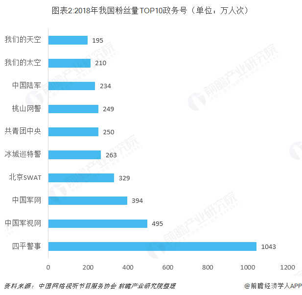 从2018年我国各类短视频账号粉丝量排行来看,政务号“四平警事”2018年粉丝量达到了1043万人次,媒体号“人民日报”2018年粉丝量达到793万人次。由此可看出短视频已成为政务和媒体信息传播的新平台。