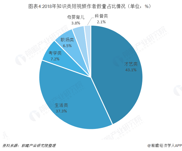从2018年知识类短视频作者数量占比情况来看,才艺类短视频作者数量占比为43.1%,其次是生活类短视频,作者数量所占比重为37.3%。